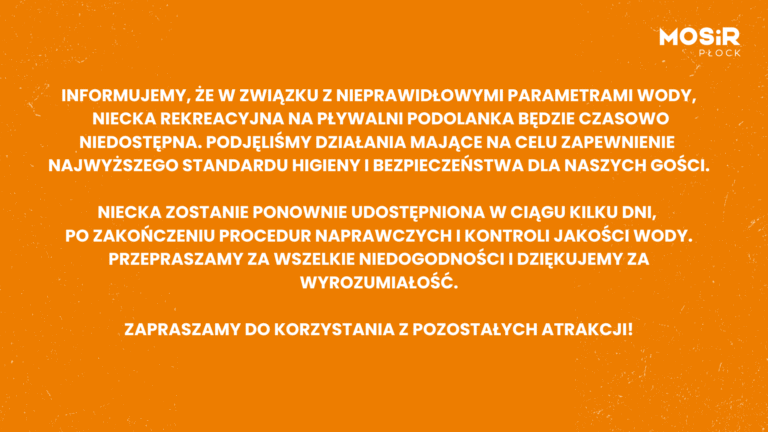 Informujemy, iż w związku z nieprawidłowymi parametrami wody, niecka rekreacyjna na terenie Pływalni Podolanka będzie czasowo niedostępna.