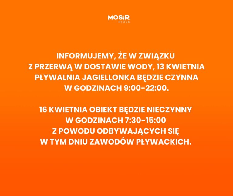 Informujemy, iż w najbliższy poniedziałek w związku z przerwą w dostawie wody Pływalnia Jagiellonka będzie czynna w godzinach 9:00-22:00.